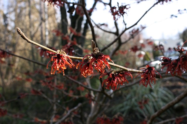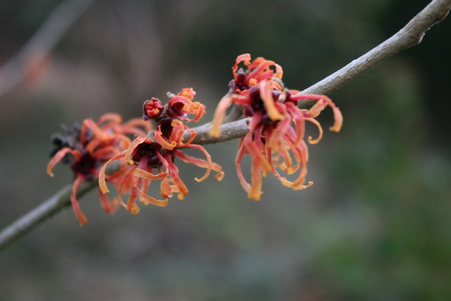 My personal favorite is Hamamelis x intermedia ‘Jelena’. Her coppery-orange spider shaped flowers are lightly fragrant and appear on bare branches.
